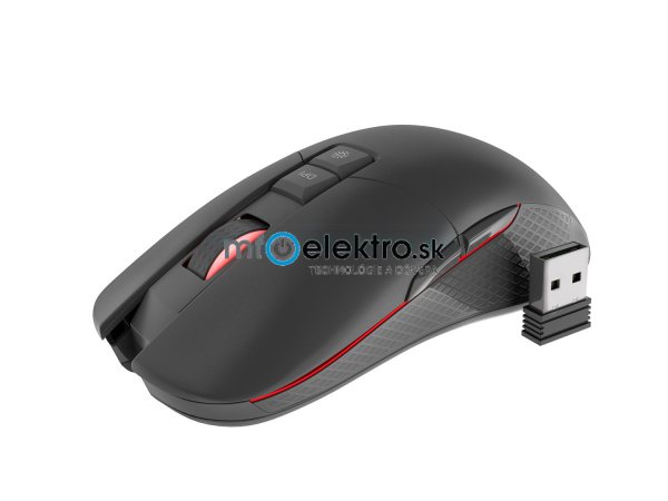 VLASTNOSTI - bezdrátová komunikace 2,4Ghz s dosahem 10m - výkonný a precizní snímač s max. rozlišením 3600 DPI - odolné spínače z životností 5 milionů kliků s rychlou odezvou - integrovaná nabíjecí baterie 750 mAh - ergonomický tvar - herní design