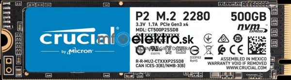 SSD disk Crucial P2 500GB SSD, M.2 2280, PCIe Gen3 x4, Read/Write: 2300/940 MB/s, Random Read/Write IOPS: 95K/215K