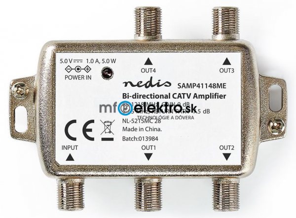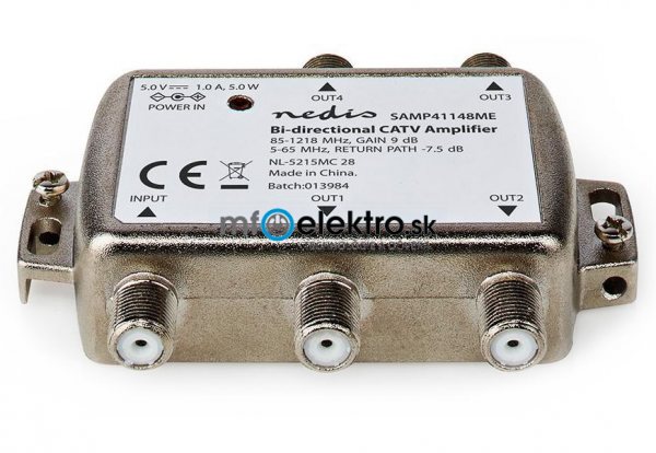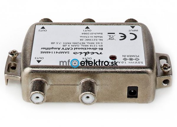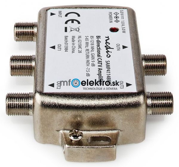 Zesilovač CATV s regulací zesílení a poklesu nabízející čtyři výstupy. Po připojení k televizní soupravě poskytuje mimořádně čistý televizní signál se zesílením 9 dB. Aktivní zpětný kanál podporuje interaktivní televizory a kabelové modemy.