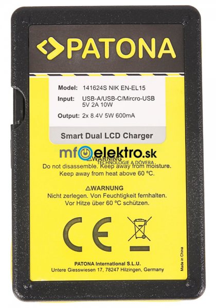S nabíječkou Patona DUAL lze nabíjet současně 2 baterie najednou, bez ohledu na to, zda mají obě baterie stejnou kapacitu. Na LCD se zobrazuje aktuální stav nabití baterie. Nabíječky jsou vyráběny dle nejvyšších evropských standardů kvality a vyznačují se extrémně dlouhou životností. Nabíječku lze napájet skrze micro USB, USB-A či USB-C port.