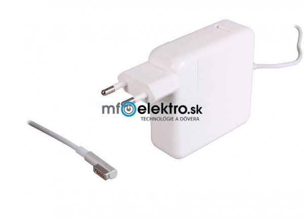 Síťový zdroj pro notebooky Apple MacBook. Součásti balení je i síťová šňůra do zásuvky.